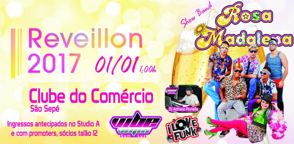 Já o Reveillon terá também a descontração da banda “Rosa Madalena”. A festa do dia 1º de janeiro de 2017 ainda terá como atração mais uma edição do “I Love Funk”, também com Dj Adriano Portella.