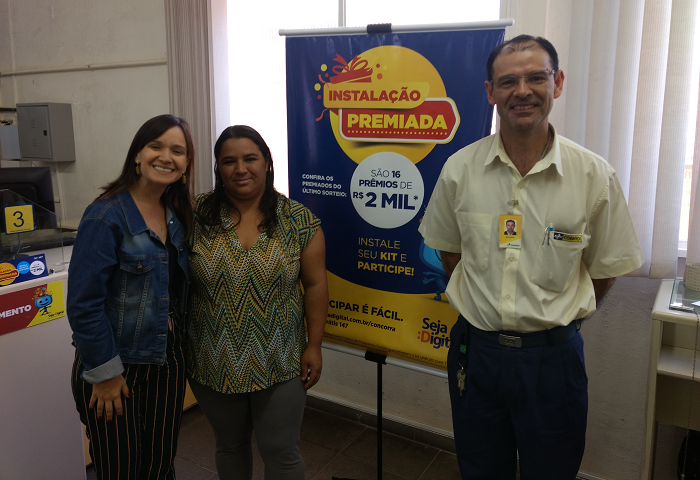 Ana Priscila Santos (ao centro da foto), moradora do Bairro Pontes, retirou e instalou o kit de TV digital gratuito, copiou o código que foi gerado na tela da televisão dela e se cadastrou. Ela foi sortuda e ganhou um cartão pré-pago que poderá ser gasto em qualquer estabelecimento.