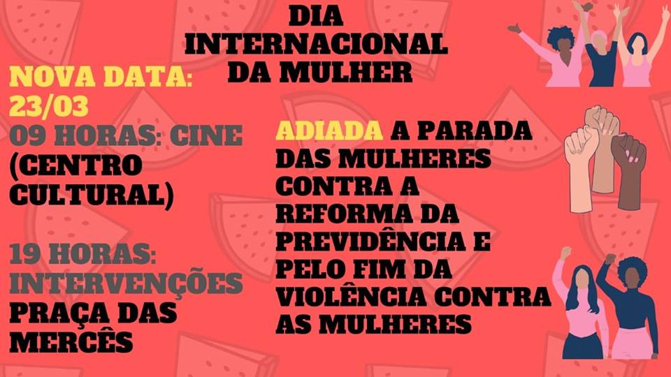 A programação ficou transferidas para sábado, 23 de março, pela manhã e tarde. Estão previstas falas e intervenções artísticas sobre a temática do Dia Internacional das Mulheres, shows de bandas locais, cine debate com o filme “O sorriso da Monalisa”, que debate questões pertinentes sobre o papel da mulher na sociedade, intervenções artísticas e uma oficina de defesa pessoal. Toda a população sepeense está convidada para somar na atividade no dia.