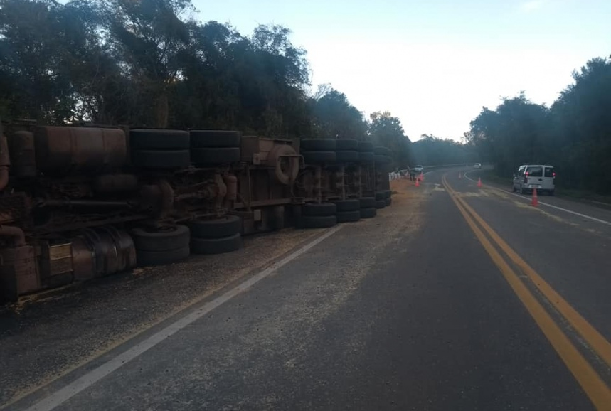 Parte da carga ficou espalhada pela pista e o tráfego está em meia pista. A previsão da PRF era de que o trânsito normalize após a retirada do material, ainda nesta manhã. As informações são do portal Farrapo.