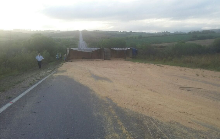 De acordo com a Polícia Rodoviária Federal (PRF), uma carreta tombou no Km 235 da rodovia. O motorista não se feriu gravemente.