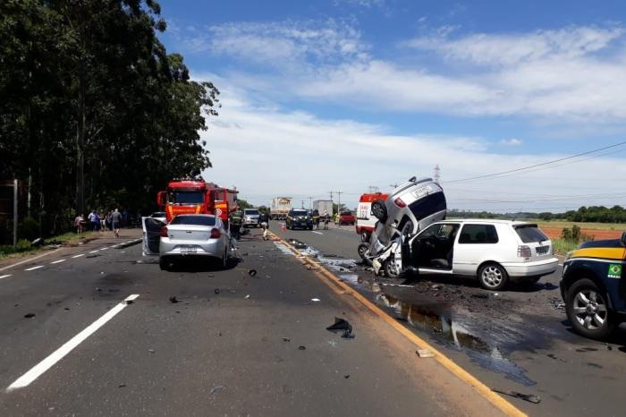 Três carros estão envolvidos na colisão — um Ford Ka, um Chevrolet Corsa e um Volkswagen Golf.
