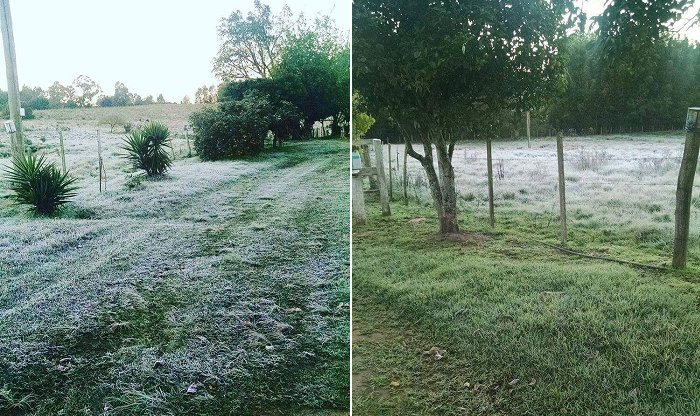 A terça-feira, 18, em São Sepé começou com temperaturas muito baixas, próximas de 0ºC. Moradores de diferentes pontos do município registraram a geada que se formou e mudou a paisagem tanto na cidade como no interior.