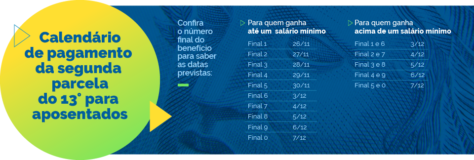 Instituto Nacional de Seguridade Social (INSS) começou, na segunda-feira, 26, o pagamento da segunda parcela do 13º salário para aposentados e pensionistas. A primeira parte do benefício foi adiantada em agosto deste ano para os beneficiários. A segunda metade do abono é paga até 7 de dezembro.