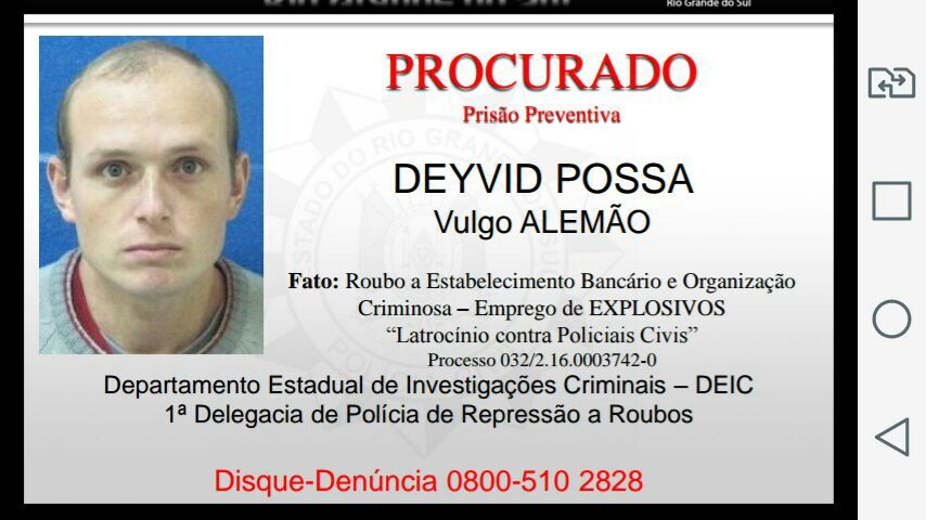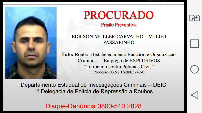 Edílson Muller Carvalho, conhecido como “Passarinho”, tem extensa ficha criminal, principalmente por roubo a bancos com explosivos. Em uma operação em Arroio dos Ratos, em novembro do ano passado, o bandido inclusive atirou contra policiais civis e deixou um agente ferido.