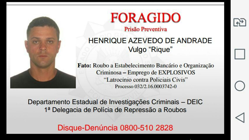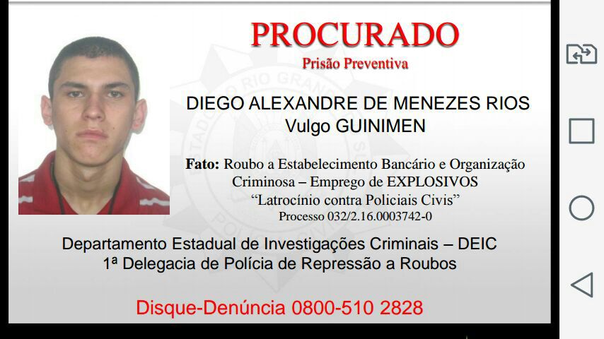 De acordo com o delegado Joel Wagner, da Delegacia de Roubos, o bandido era o mais procurado do RS, principalmente por ações com uso de explosivos. Outros três membros da quadrilha de Passarinho estão foragidos e sendo procurados pela polícia.