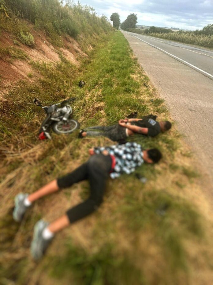 A motocicleta foi recolhida ao depósito credenciado pelo Detran, os dois indivíduos foram encaminhados para exame de lesões e posteriormente feito o registro da ocorrência, onde foram apreendidos os telefones celulares, após foram liberados.