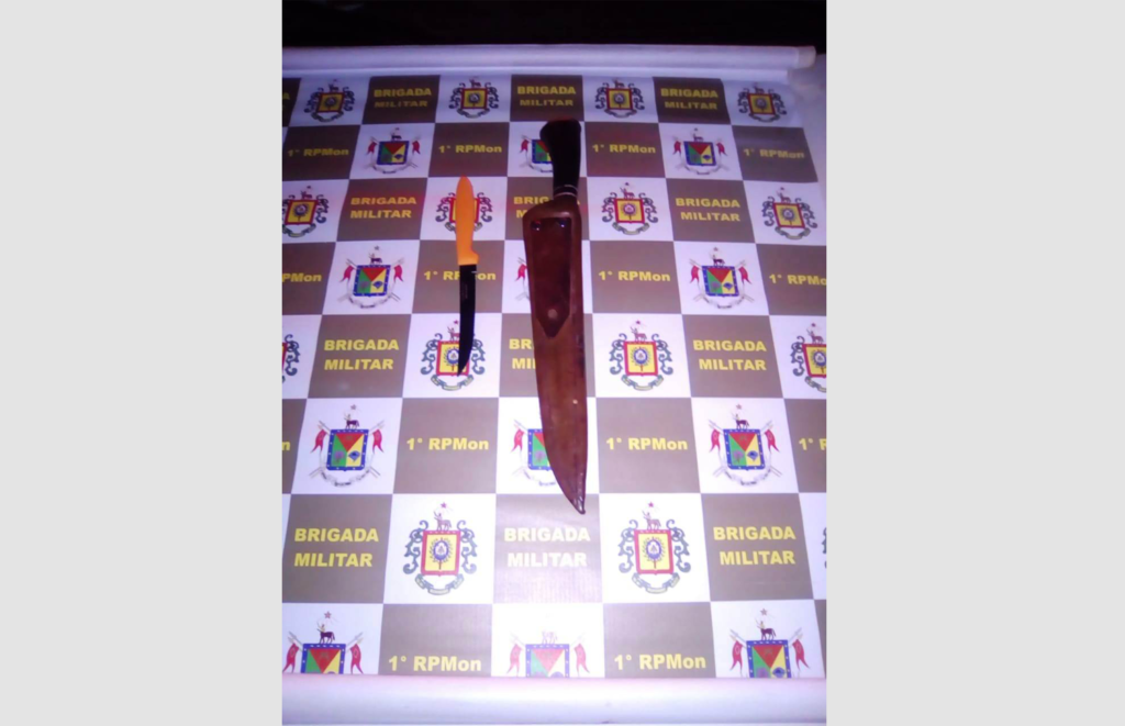 Ainda no início da madrugada a guarnição flagrou, na praça das Mercês, um veículo com placas de Alvorada, sendo que ao realizar a revista no interior do carro foi encontrado um facão de 25cm de lâmina. Os policiais apreenderam o material e confeccionaram um Boletim de ocorrência sobre o fato.