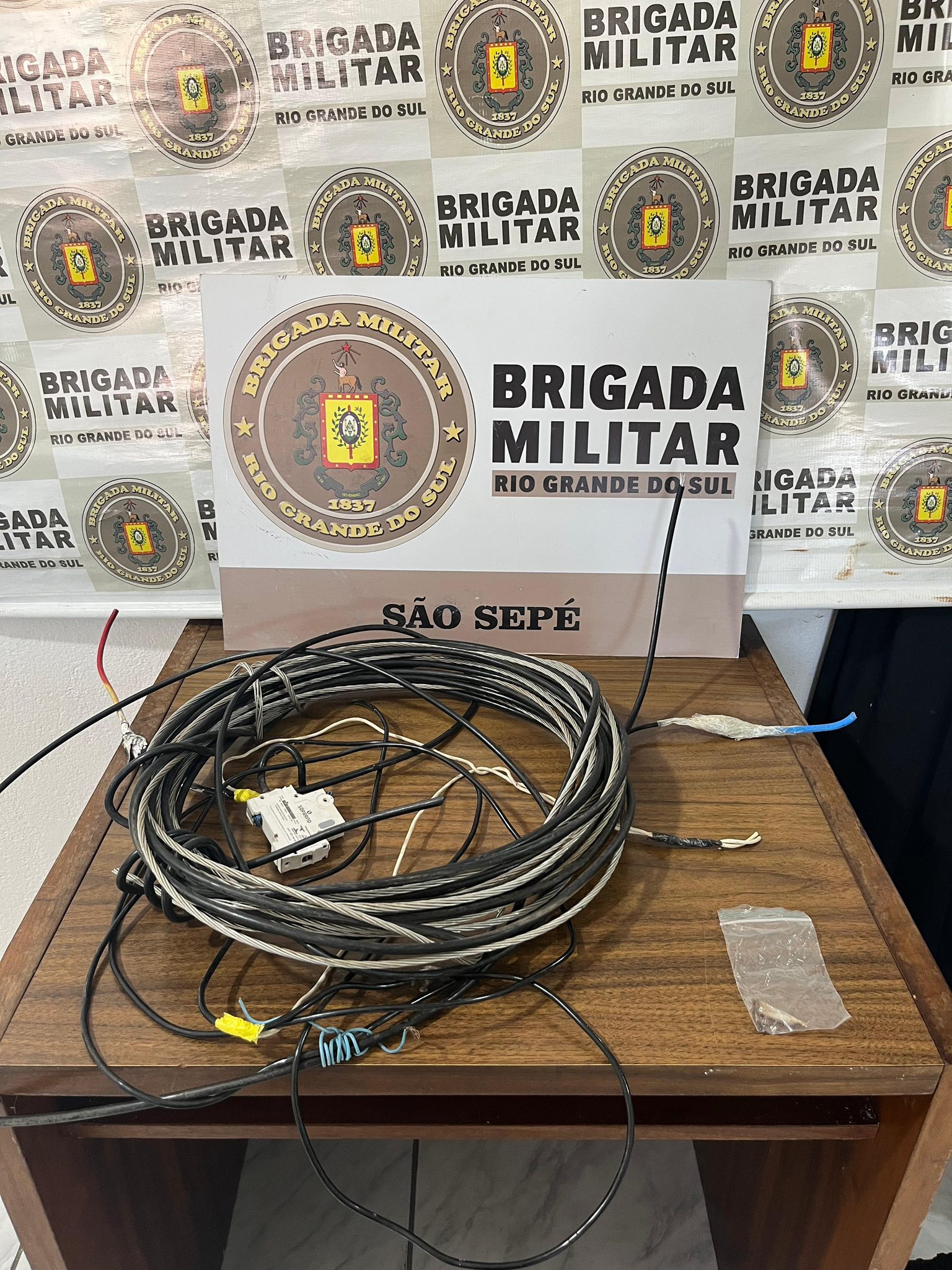 Durante a averiguação na residência, foram apreendidos dois rolos de fios de condutividade elétrica, com peso aproximado de 1,7 kg, possivelmente oriundos de furto. Também foi localizada uma bituca de cigarro contendo substância análoga à maconha, que estava sob um fogão.