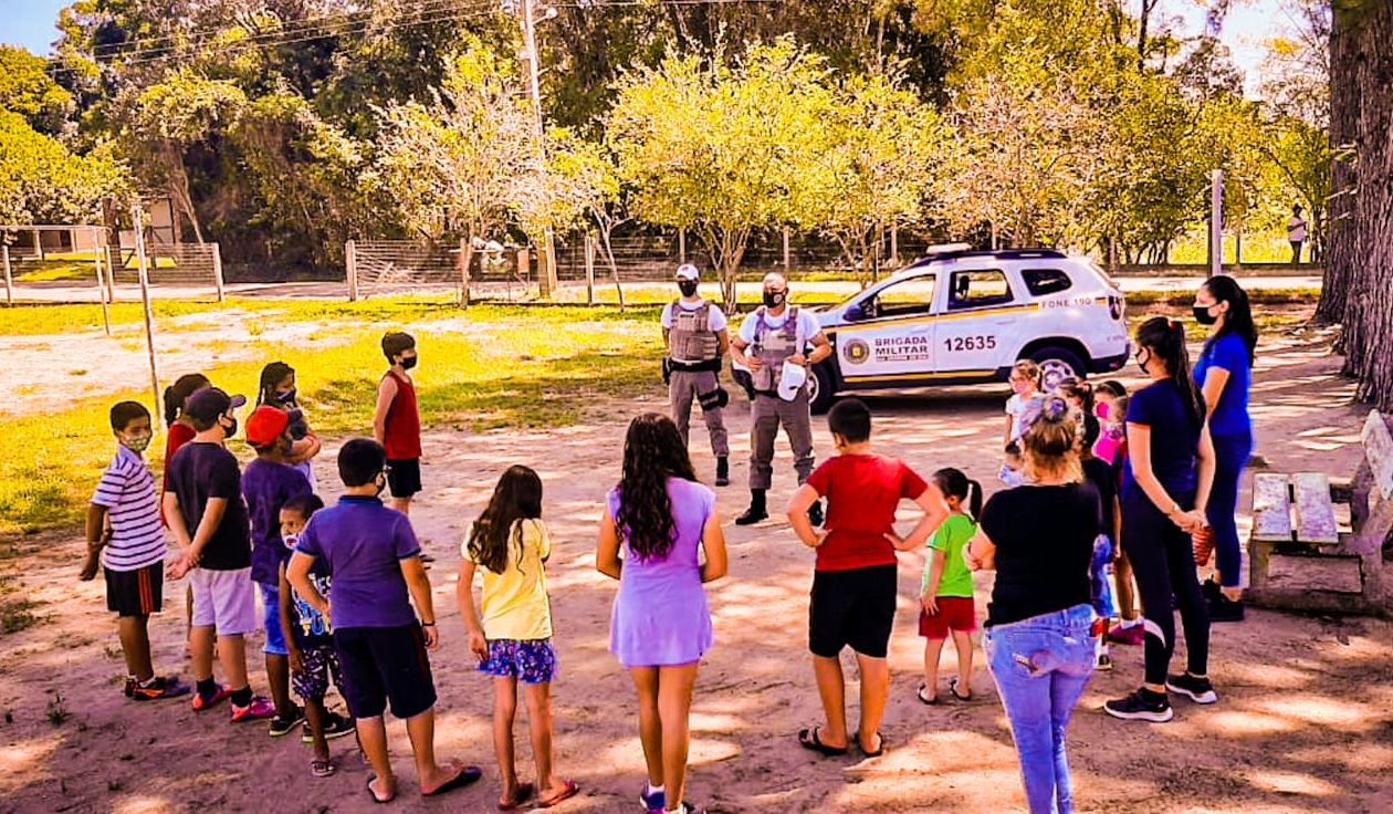 Segundo o Sargento Everaldo, serão realizadas durante o ano letivo visitas Às escolas e desenvolvidas atividades relacionadas à área da segurança pública junto À rede escolar. Participaram das atividades o Sargento Everaldo, Soldado Fraga e Soldado Pozzobom.