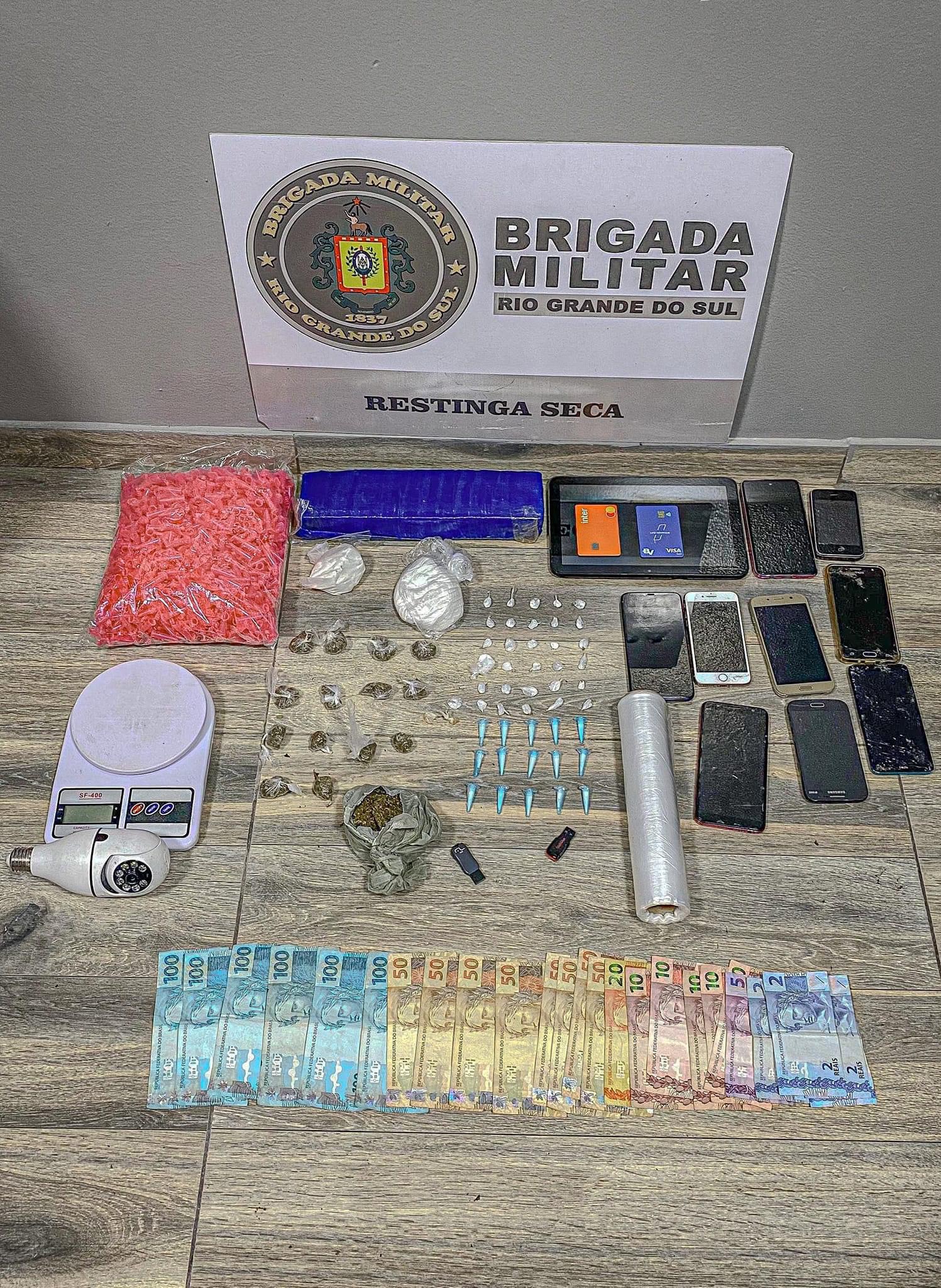 A Brigada Militar na noite deste domingo (10) quando em patrulhamento tático motorizado na rua Teodoro Marquet, bairro São Luis, em Restinga Sêca, a equipe de força tática em incursão a pé em local já conhecido pelo tráfico de drogas, visualizaram da calçada da residência, uma mulher, uma jovem e um jovem fracionando e embalando entorpecentes, diante desse fato a equipe adentro a residência e deteve as partes em flagrante, sendo encontrado embaixo da mesa, 01 tijolo de uma substância com odor e cor semelhante a maconha, já sobre a mesa 02 porções de uma substância com cor e características semelhantes a cocaína, 31 buchas de uma substância com cor e características semelhantes a cocaína, 15 eppendorfs, 02 porções de uma substância com características semelhantes ao crack, 01 balança de precisão, 01 rolo de embalagem, 01 tablet, 09 telefones celulares e R$ 1.085,00 em moeda corrente. No Pátio da resistência foram encontrados 01 câmera de monitoramento, e enterrado no pátio 01 saco com 1.000 eppendorfs, 01 porção de uma substância semelhante a maconha.