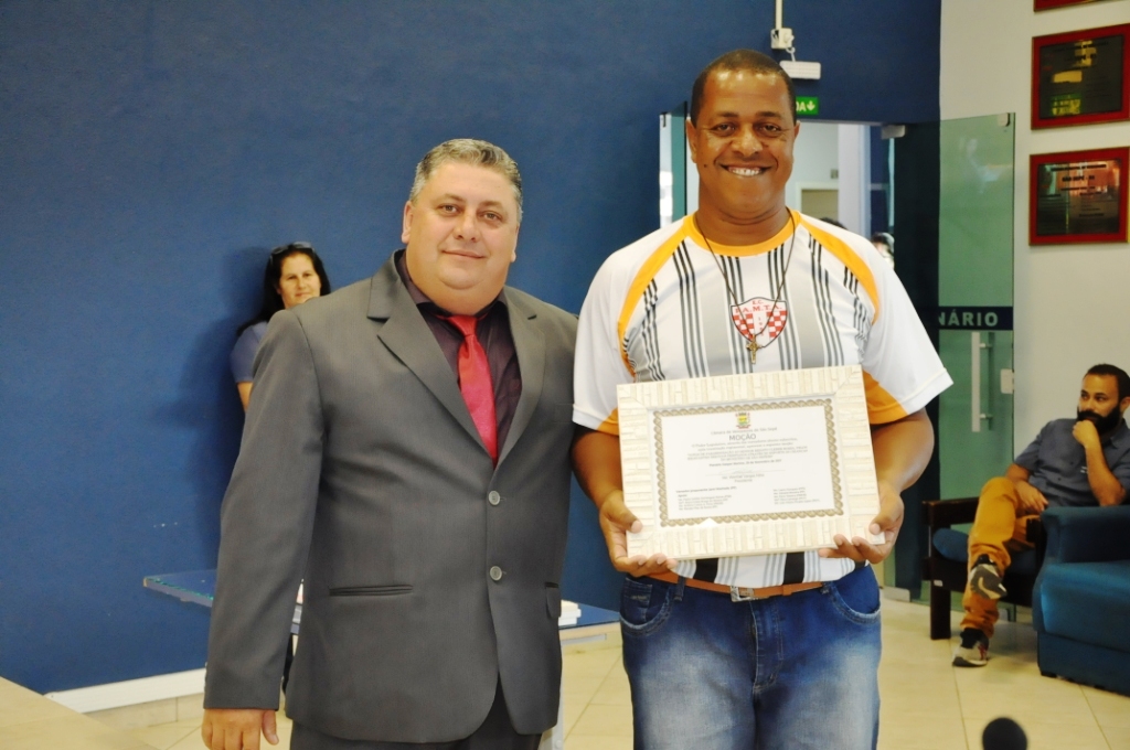 O primeiro a receber a honraria foi Renato Cleber Borba. O líder comunitário tem bastante atuação em diversos segmentos da comunidade, como movimentos religiosos, escolas, mas foi o trabalho desempenhado no esporte, com crianças de São Sepé, o destaque reconhecido pela moção. O vereador Janir Machado (PP), proponente da ação, lembrou em seu discurso a simplicidade do homenageado. “O Cleber é uma pessoa que se doa pela comunidade, que merece esta moção e que faz um belíssimo trabalho com as crianças no futebol, é aquele que não mede esforços para ajudar estes jovens no esporte”, disse Janir. Depois de entregue a homenagem, foi a vez de Cleber agradecer emocionado. “Muitas pessoas me ajudam para que eu consiga realizar todos estes projetos, é um momento muito especial para mim mas eu dedico a todos que estão comigo nesta caminhada”, destacou Cleber. Entre os convidados, o pároco Gerson Gonçalves acompanhou a homenagem ao esportista. Cleber é voluntário na Paróquia Nossa Senhora das Mercês e atua nos grupos de jovens e catequização.