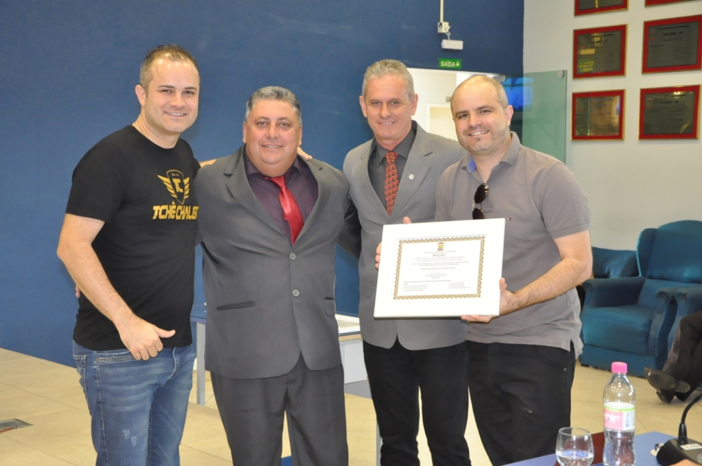 Depois foi a vez do Tchê Chaleira receber uma moção pela trajetória de sucesso dentro da música Sul Brasileira. O grupo que é de São Sepé tem se destacado no cenário musical neste ano, conseguido emplacar uma das músicas mais tocadas nos rádios, “Tô bebendo demais”, parceria com o cantor Serginho Moah. O vereador Renato Rosso (PP) foi autor da moção juntamente com o colega de bancada Janir Machado. Rosso lembrou a atuação do grupo no país. “O Tchê Chaleira é uma prova de que São Sepé dá certo, são pessoas que trabalharam muito para chegar onde estão e que levam o nome da nossa cidade para todo Brasil, é importante destacar esse sucesso”, ressaltou o vereador. O grupo foi representado por Roger e Anderson Wegner que, emocionados, agradeceram a moção. “Hoje nós temos 12 famílias que dependem da gente, e vocês sabem que viver da música no Brasil não é fácil, mas a gente sempre teve o apoio de pessoas que nos ajudaram, como nosso pai que não está mais conosco e dedicamos essa homenagem a ele, que sempre sonhou com nosso sucesso”, disse Anderson.