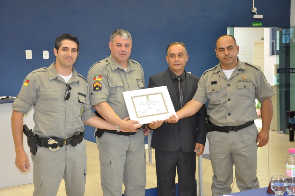 Por fim, foi a vez de destacar os 180 anos da Brigada Militar no Estado. O sargento Oliveira e os soldados Tomazetti e Moreira receberam a moção proposta pela mesa diretora. O presidente da Câmara, Eto Vargas, destacou o trabalho dos policiais. “São pessoas que merecem nosso reconhecimento, pois trabalham arduamente em defesa de nossa segurança, são policiais que vivem momentos difíceis mas que estão sempre prontos para atuar”, lembrou o vereador. O sargento Oliveira agradeceu a moção. “Hoje nós trabalhamos com um efetivo pequeno mas as dificuldades não impedem a gente de seguir trabalhando em prol da comunidade, das pessoas que aqui vivem”, afirmou Oliveira.