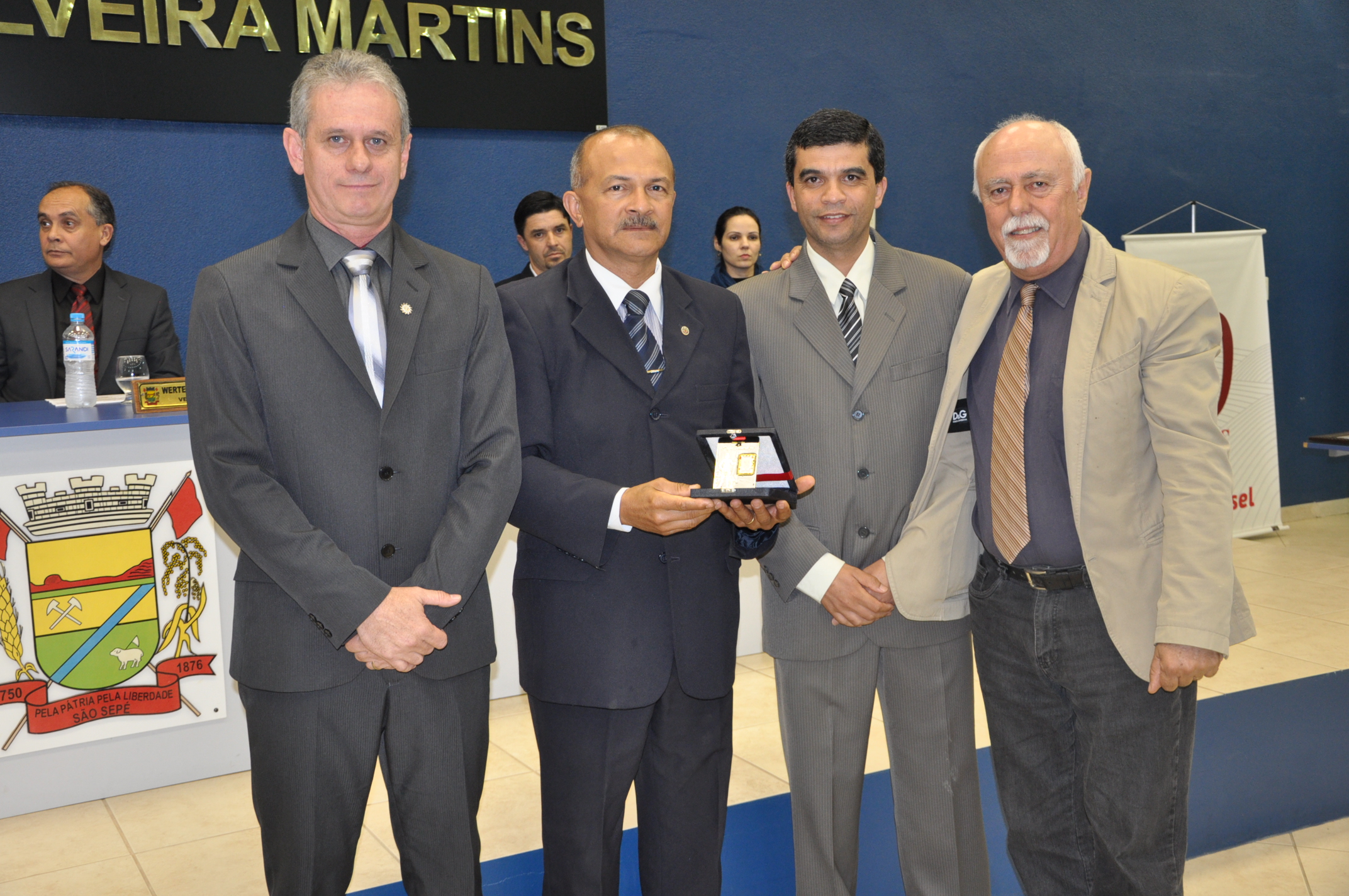 A Câmara de Vereadores teve Sessão Especial de entrega de homenagens, na noite de terça-feira, 12. Na oportunidade, receberam Moções Legislativas a Cooperativa Tritícola Sepeense, o Colégio Madre Júlia e a Sociedade Esportiva e Recreativa (S.E.R.) Iguaçu. Já o delegado substituto da Delegacia de São Sepé, Antônio Firmino de Freitas Neto, recebeu a Medalha Sepé Tiaraju, uma proposição do vereador Renato Rosso (PP), pelos relevantes serviços prestados pelo chefe da Polícia Civil de São Sepé.