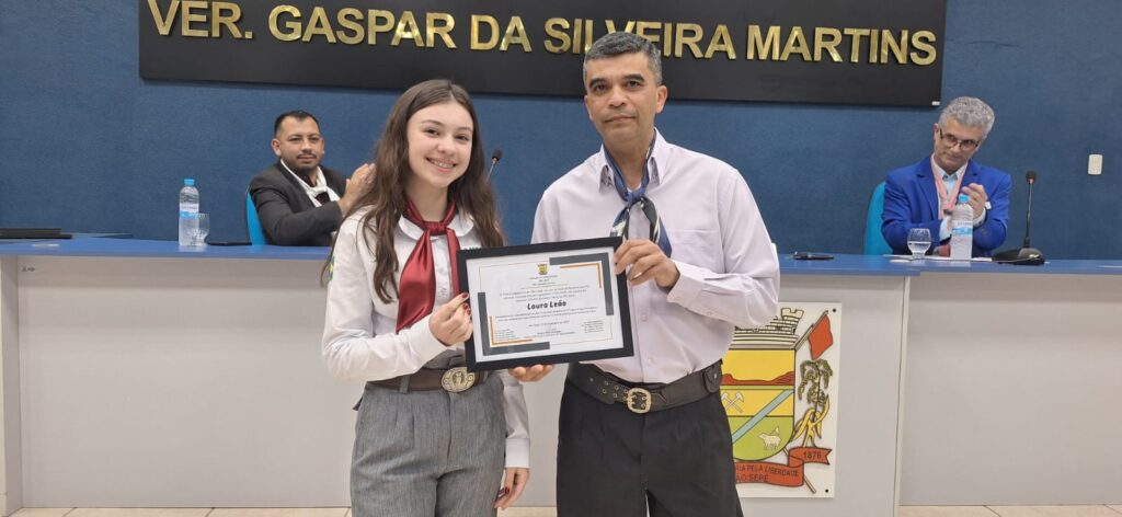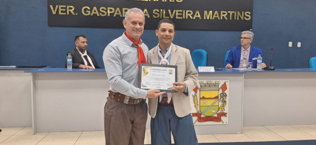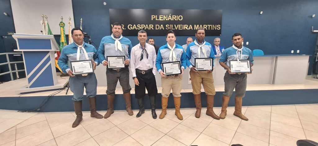 Durante a cerimônia, o vereador Gilvane Bandeira Moreira (PP) entregou moções legislativas em homenagem a laçadores e laçadoras que se destacaram no Rodeio Internacional Conesul 2025, em Santa Maria. Entre os agraciados estiveram Elzemi Silva, campeão no Laço Vaqueano; a equipe do CTG Ronda Crioula, vice-campeã da Força B; e a jovem Laura Leão, primeira colocada no Laço Prendinha e campeã no Duelo Rainha do Conesul.