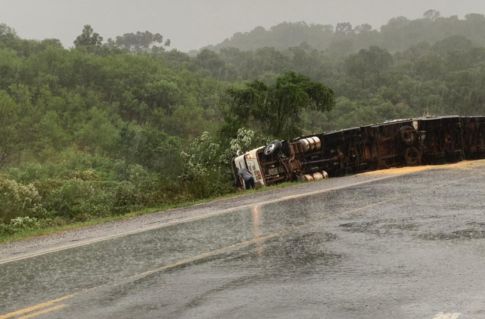 Um caminhão bitrem carregado de soja tombou na BR-392, em Caçapava do Sul, na tarde desta quinta-feira, 4.