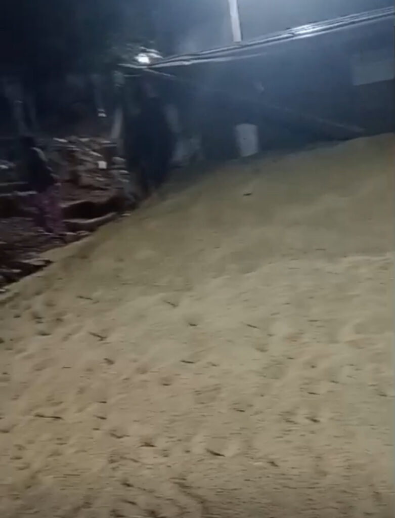 Sem controle, o caminhão acabou descendo e tombando, espalhando a carga na via. O motorista não se feriu.