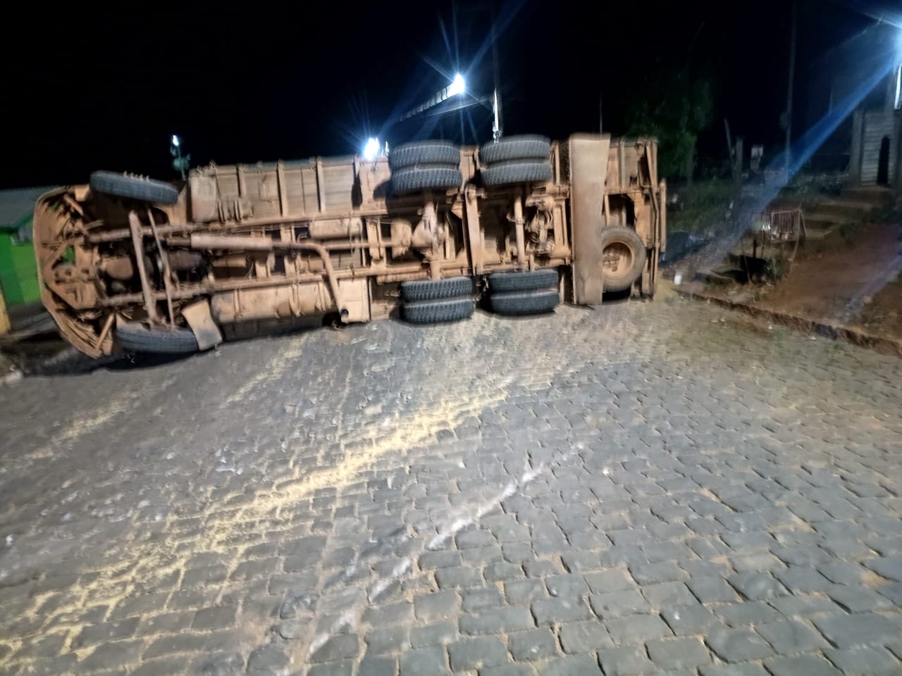 Sem controle, o caminhão acabou descendo e tombando, espalhando a carga na via. O motorista não se feriu.