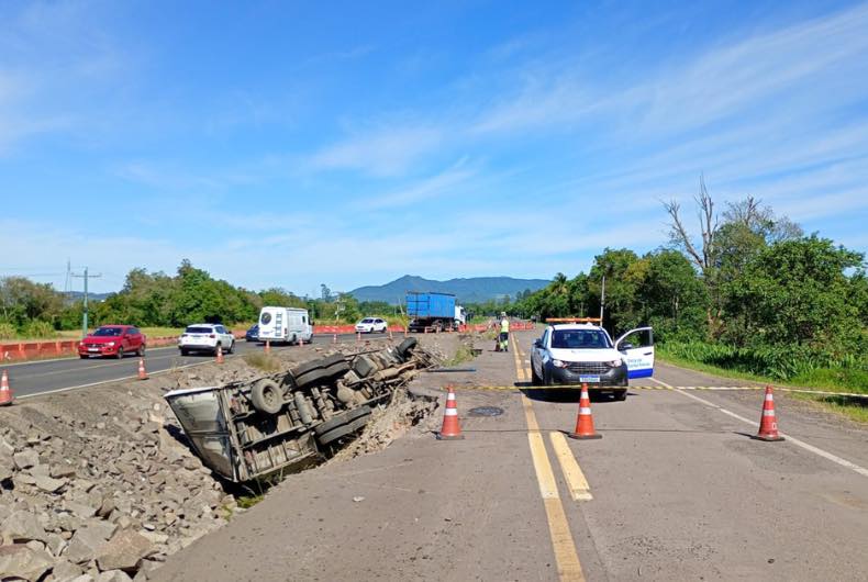 Conforme informações, por volta das 5h, o veículo seguia em direção a Santa Maria quando o motorista perdeu o controle e acabou tombando em uma valeta no desvio existente no local, trecho que substitui parte da pista principal danificada pelas enchentes do ano passado.