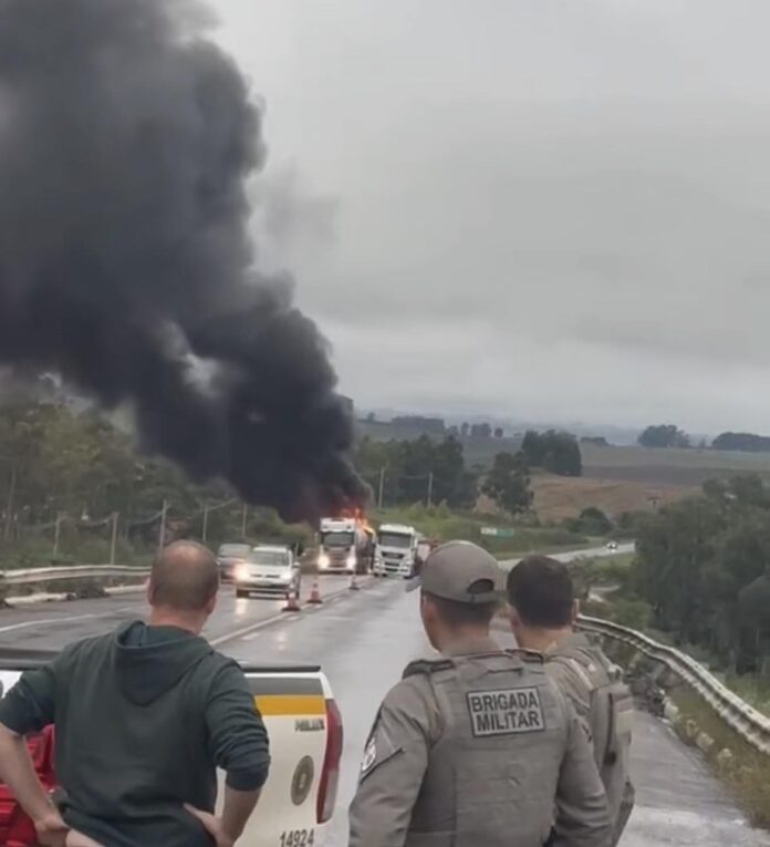 Carreta pega fogo e bloqueia BR-287 em São Pedro do Sul