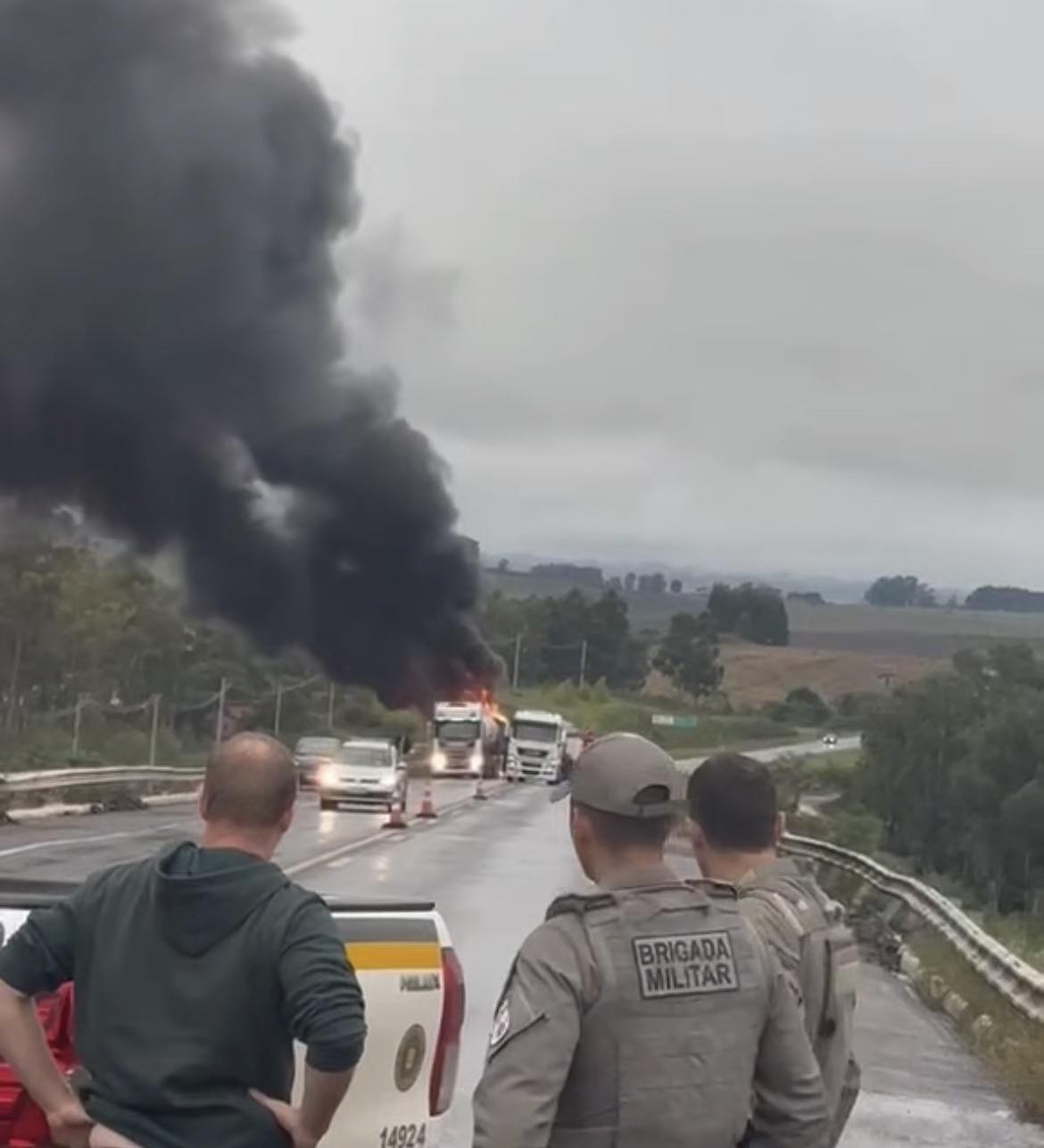 Equipes da Polícia Rodoviária Federal (PRF) e do Corpo de Bombeiros foram acionadas e atuaram no controle do incêndio, além de garantir a segurança dos motoristas que passavam pelo local.