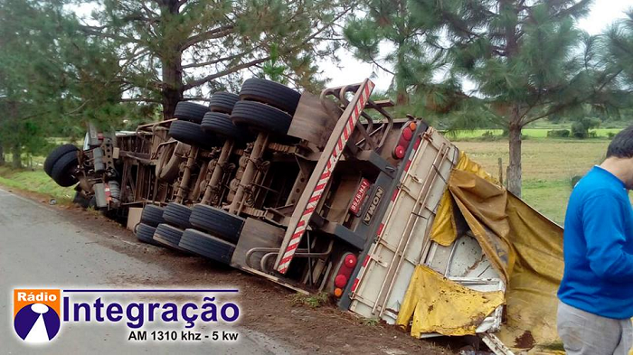 Uma carreta com placas de Restinga Sêca, tombou na manhã desta segunda-feira, 29, na ERS-149, no km 99, na localidade de São Miguel dos Carvalho, em Restinga Sêca.