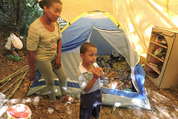 No início dormiam embaixo de árvores, que fazem parte da mata ciliar do Rio Jacuí. Tiveram que mudar de local devido ao aparecimento de cobras. Depois de ganharem a barraca iglu, conseguiram uma lona plástica que dá mais proteção contra o vento, a chuva e proteção à noite.