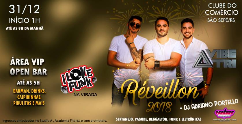 Já para o Reveillon a festa comandada pela banda Vibe Tri promete o melhor do sertanejo, funk, pagode e eletrônicas, além do DJ Adriano Portella que continua a noite com especial “I Love Funk – A Virada”, que promete animação até às 8h da manhã. O evento tem lote especial a R$ 15 (1º lote), R$ 20 (2º lote) e R$ 25 (3º lote). O salão terá uma área vip open bar (até às 5h). Os valores são R$ 60 masculino e R$ 50 feminino no 1º lote e R$ 70 masculino e R$ 60 feminino no 2º lote. Sócios pagam somente a diferença do valor entre ingresso normal e ingresso vip. Quem tiver adquirido ingresso normal e quiser participar da área especial open bar também pode pagar a diferença na hora da festa.