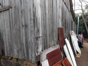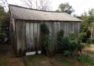 A casa de madeira, que fica na Rua Conceição Curto, nos fundos do centro de reciclagem do Bairro Lôndero, está em estado precário. No local mora a Dona Maria da Graça Pereira, o esposo dela, Marino Aires Bitencourt, além de mais quatro pessoas.