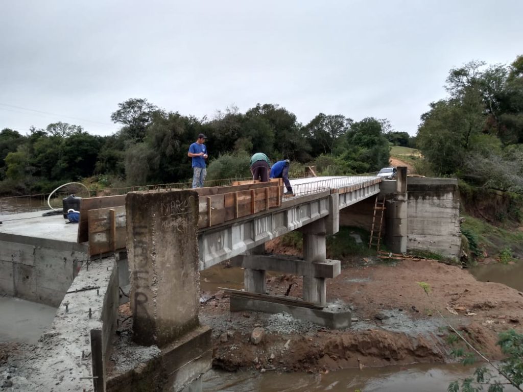 Nem a chuva impediu a continuidade da obra da ponte sobre o Arroio São Rafael, no interior do município. Na tarde da quinta-feira, 26, operários realizaram mais uma etapa do processo de concretagem da estrutura. O trabalho foi acompanhado pelo engenheiro do município, Rafael Liberalesso.