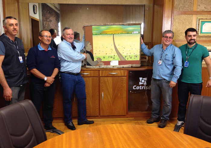 A homenagem foi feita através dos empregados Moacir Luiz Pires da Fonseca, Patrick da Silva Rosa e Vanderson Antonelli Reinstein, que estiveram na sede da Cotrisel, para a entrega de um quadro pintado pela artista Ângela Freitas, de São Sepé.