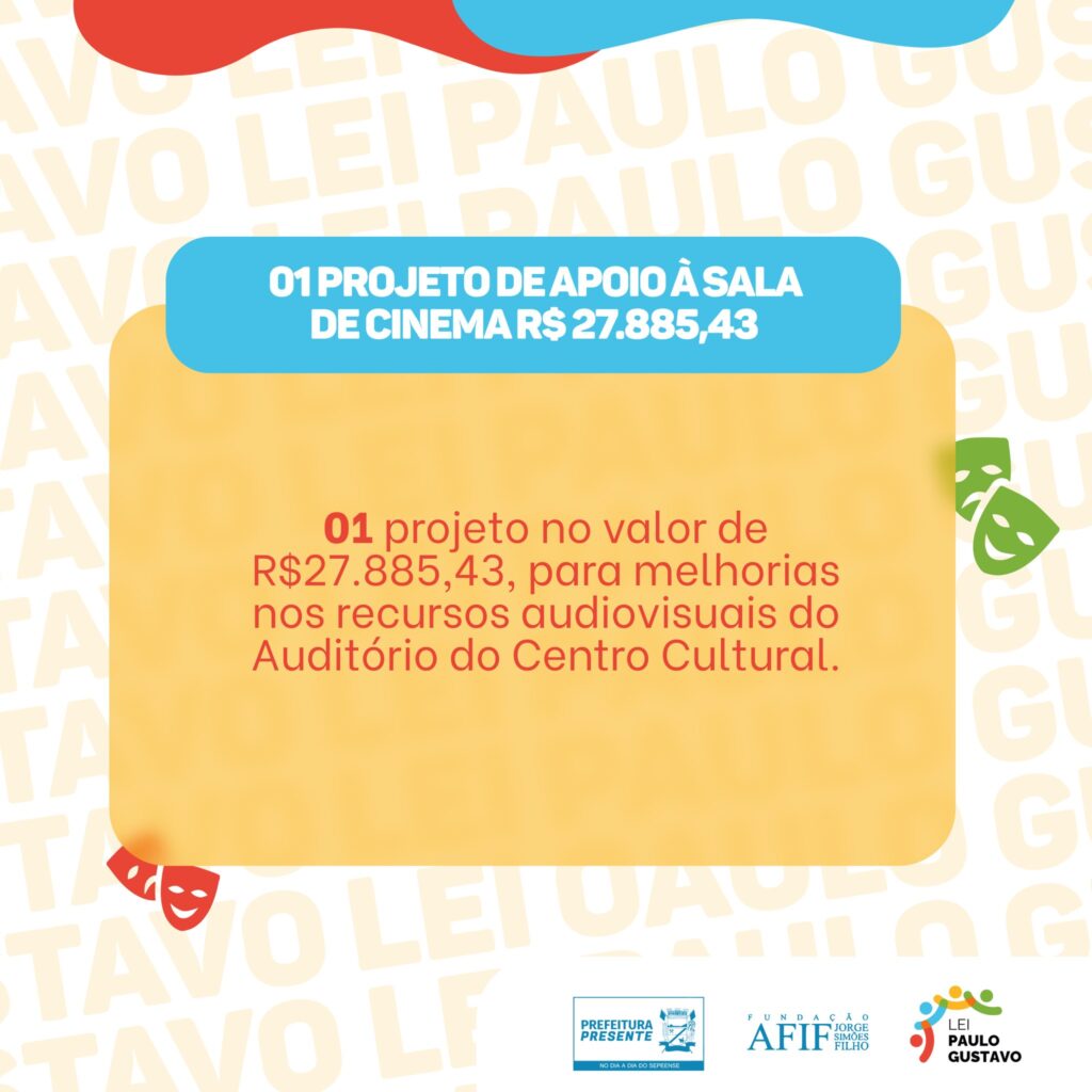 – 1 projeto no valor de R$27.885,43, para melhorias nos recursos audiovisuais do Auditório do Centro Cultural.