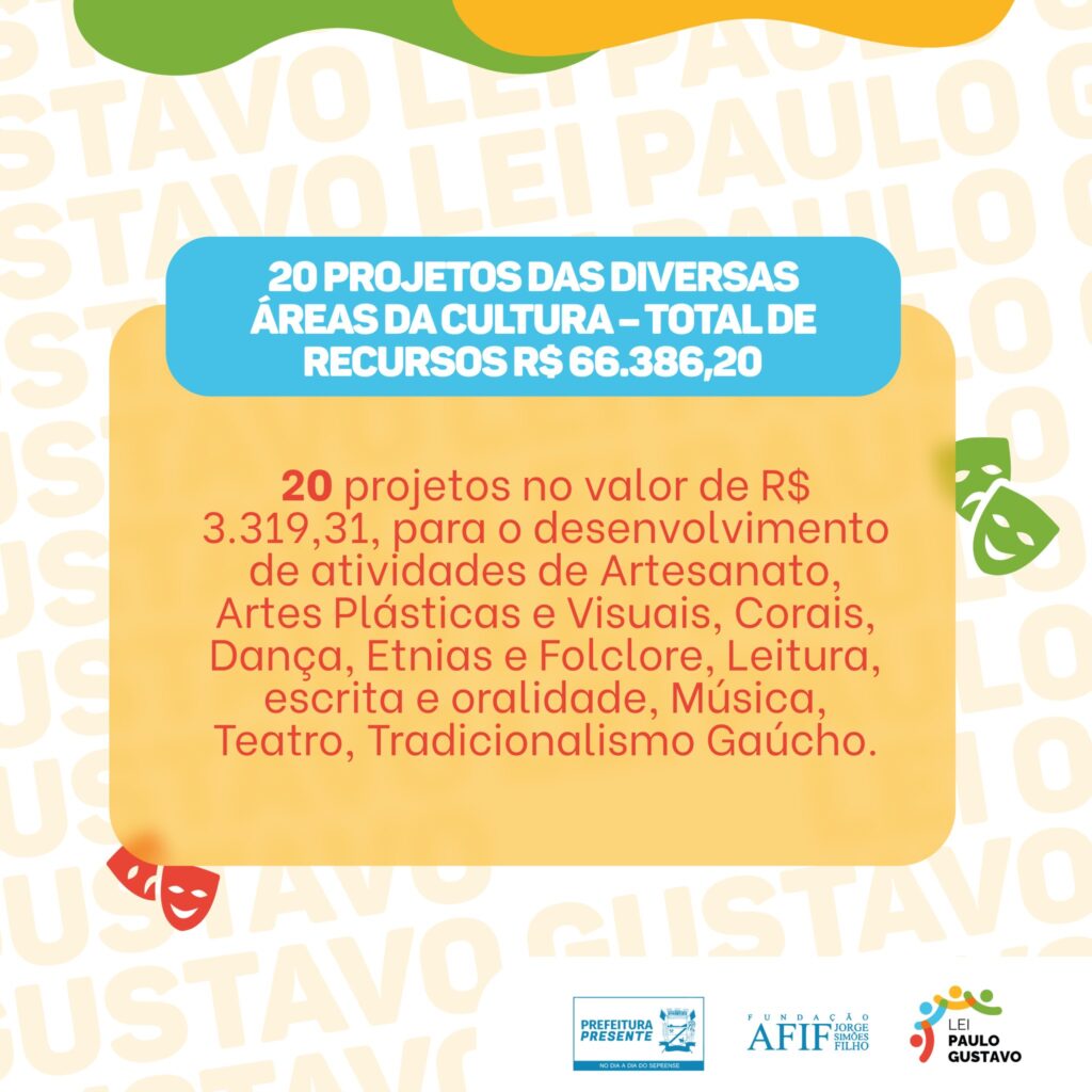 – 20 projetos no valor de R$ 3.319,31, para o desenvolvimento de atividades de Artesanato, Artes Plásticas e Visuais, Corais, Dança, Etnias e Folclore, Leitura, escrita e oralidade, Música, Teatro, Tradicionalismo Gaúcho.