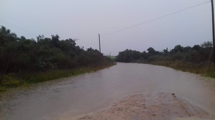 O grande volume de chuva que atinge São Sepé neste final de semana voltou a bloquear parte da estrada na localidade de “Passinhos”, no Terceiro Distrito. Segundo a moradora Marlisa Giuliani Ferreira, até o momento já choveu 98mm.