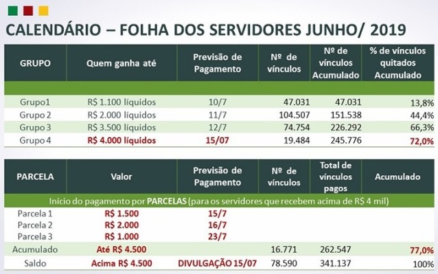 Para a quitação da folha de junho, o governo do Estado adotou um sistema misto de pagamento por grupos e parcelas. Todos os servidores do Executivo que recebem até R$ 4.000 líquidos terão os salários pagos até 15 de julho.