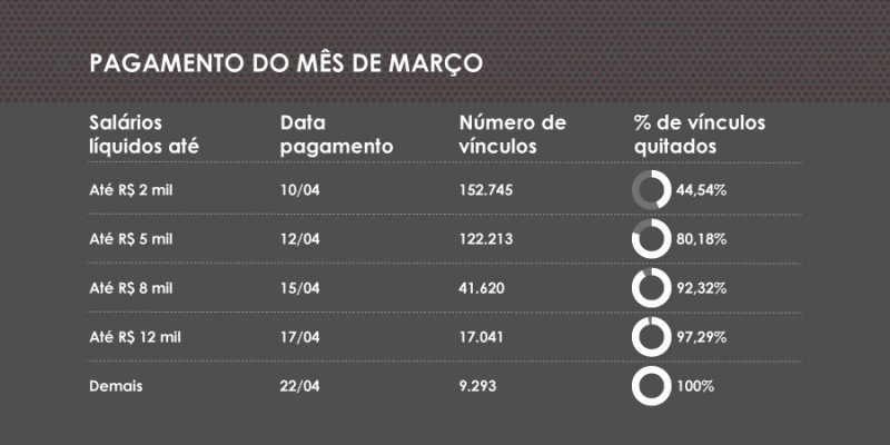 A quitação total do pagamento dos salários líquidos deve ocorrer no dia 22 de abril, segundo a projeção da Secretaria da Fazenda.
