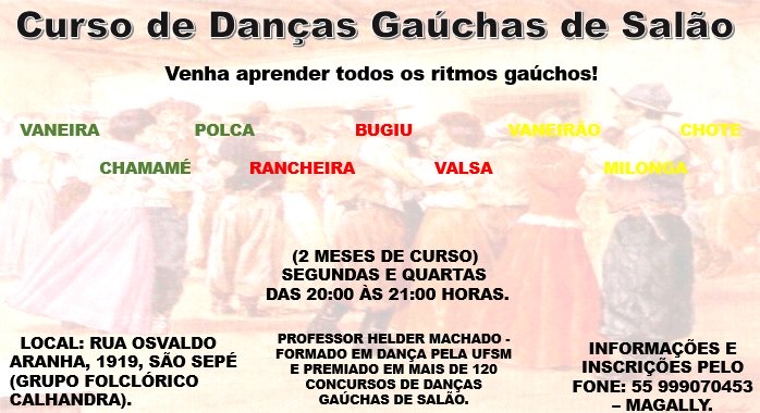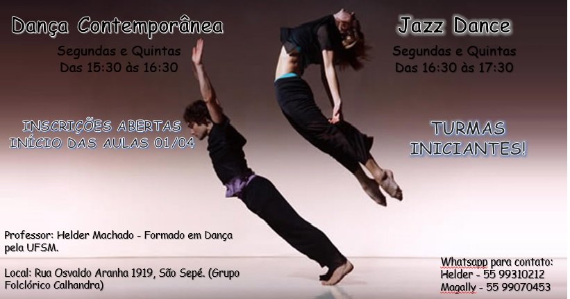 O Grupo Folclórico Calhandra está com inscrições abertas para curso de dança contemporânea, jazz dance, e gaúchas de salão para casais. Haverá aula inaugural e gratuita no dia 1º de abril.