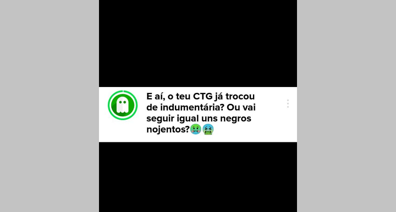 Recentemente duas integrantes da Invernada Tio Mino receberam mensagens de discriminação, nas quais uma pessoa teria mandado a mensagem “teu CTG já trocou de indumentária ou vai seguir igual uns negros nojentos?”.