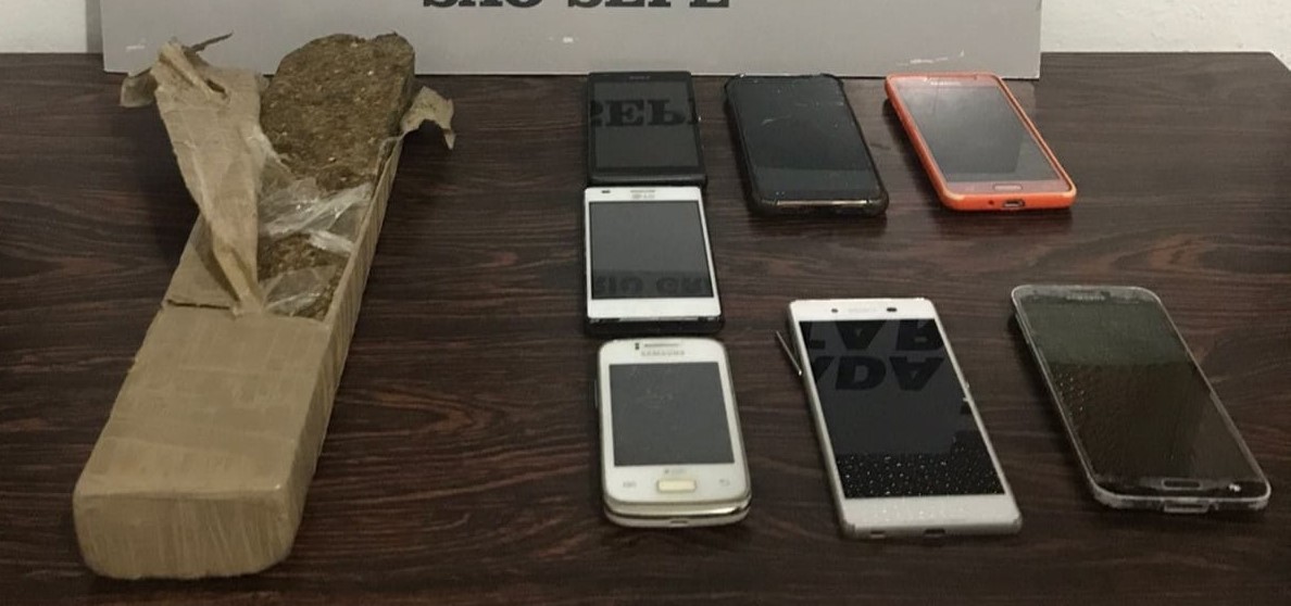 No pacote, os policiais encontraram 950 gramas de substância semelhante a maconha, sete aparelhos celulares e um chip.