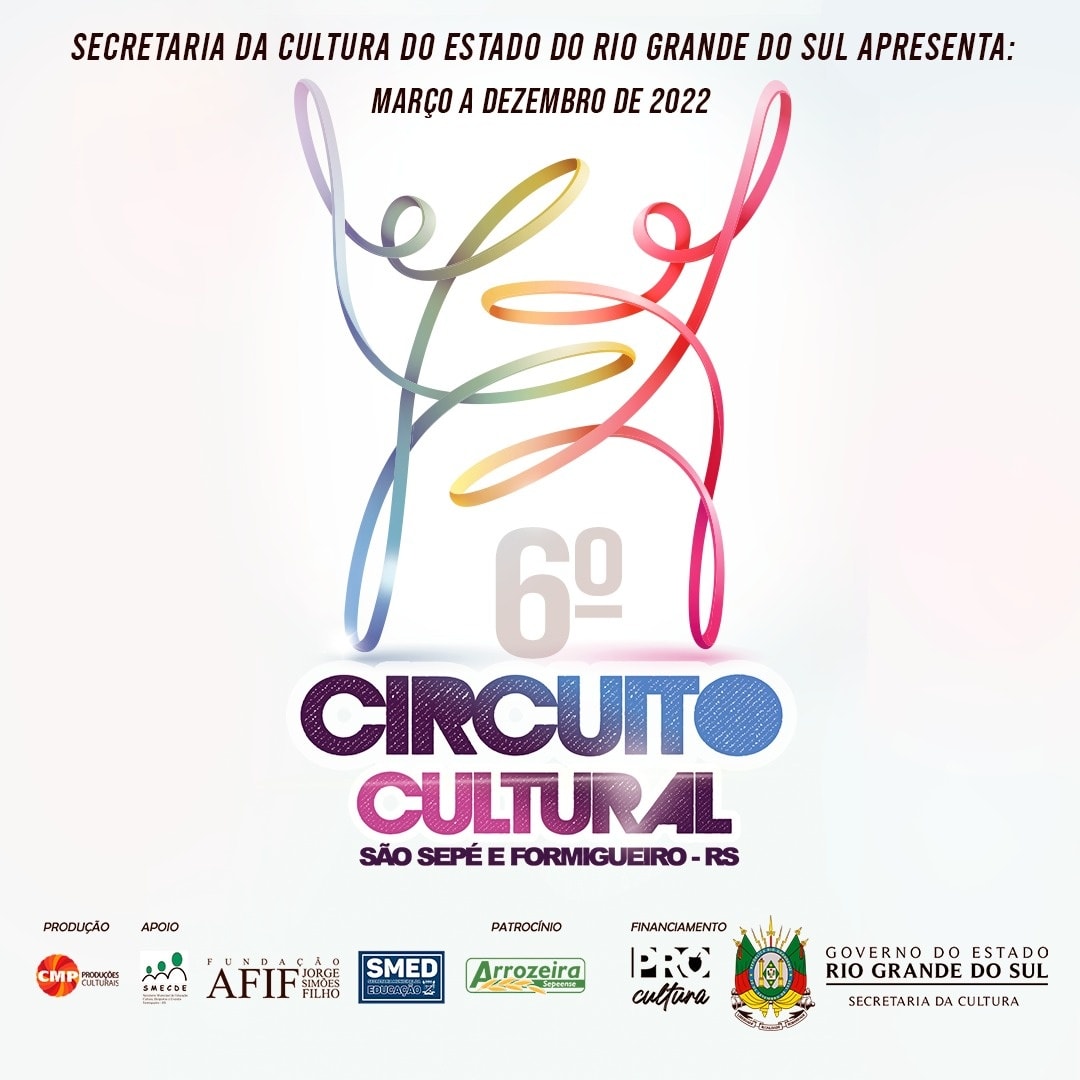 O projeto 6º Circuito Cultural é uma produção da CMP Produções Culturais, apoio da Fundação Cultural Afif Jorge Simões Filho, SMED de São Sepé e SMECDE de Formigueiro, com patrocínio da Arrozeira Sepeense e financiamento do PRO-CULTURA – Governo do Estado do Rio Grande do Sul.