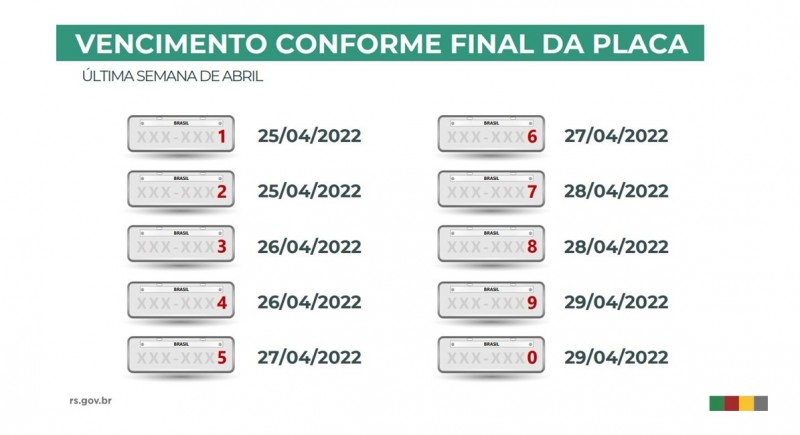 Os veículos com placas de final 1 e 2 terão como data limite a última segunda-feira do mês de abril (25/4). Os vencimentos dos números seguintes ocorrerão ao longo da semana, se encerrando na sexta-feira, 29 de abril.