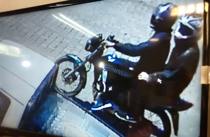 A dupla roubou dinheiro e fugiu do local de motocicleta. Imagens de câmeras de monitoramento devem ajudar a polícia na identificação dos suspeitos.