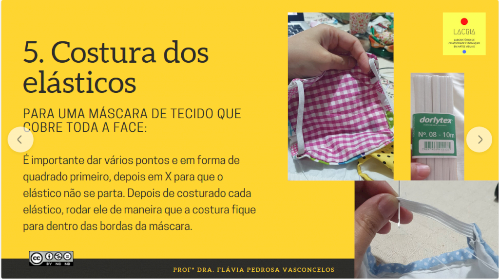 • Também é importante ter elásticos ou tiras para amarrar acima das orelhas e abaixo da nuca. Desse jeito, o pano estará sempre protegendo a boca e o nariz e não restarão espaços no rosto