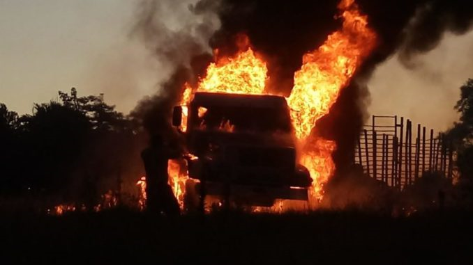 De acordo com o Corpo de Bombeiros, um homem tocou fogo no próprio caminhão, da marca Mercedes Benz, placas de Santa Maria, na Rua Viterbo Andrade da Silva, na Vila Severo, no Bairro Lorenzi. O caminhão estava desligado e estacionado em um terreno baldio. O veículo foi totalmente destruído pelas chamas.