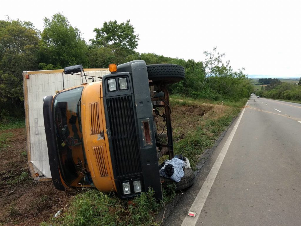 Um caminhão baú com placa de Santa Maria tombou na BR-392 na noite da última quarta-feira, 18. O motorista do veículo disse que a saída de pista aconteceu para evitar um acidente.