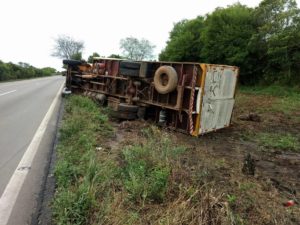 De acordo com o caminhoneiro, outro veículo de igual porte precisou se deslocar para que a carga fosse transferida. Com receio de que o material fosse furtado, ele acabou passando a noite no local do acidente.