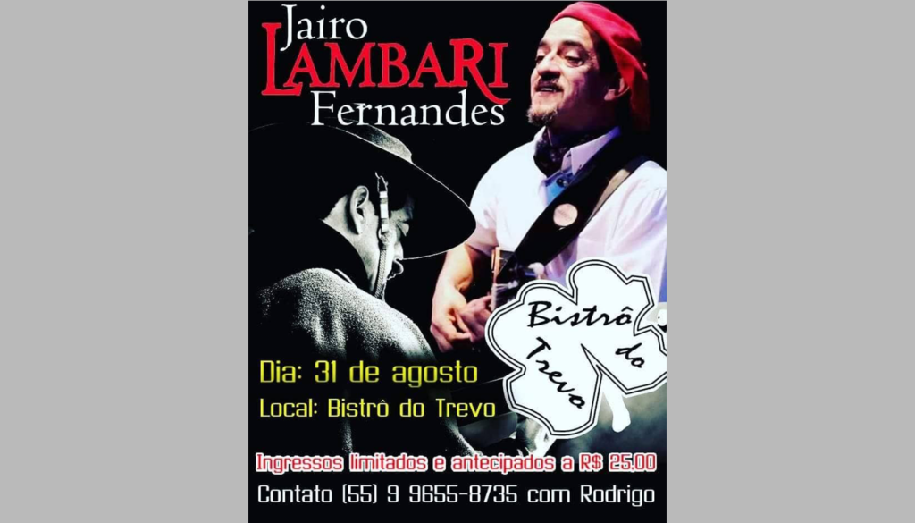 O músico nativista Jairo Lambari Fernandes faz show em São Sepé no dia 31 de agosto, sexta-feira. A apresentação acontece no Bistrô do Trevo.