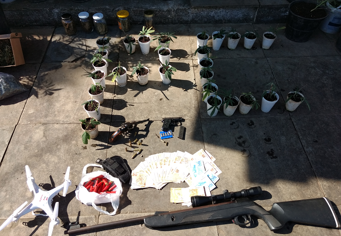 Além das diversas plantas, os policiais apreenderam R$ 1.500 reais e $ 200 dólares. Duas espingardas, um revólver, uma pistola e um drone também estão nos materiais recolhidos. À polícia, o homem disse que o produto era destinado a consumo próprio. Parte da droga também estava enrolada em jornais.