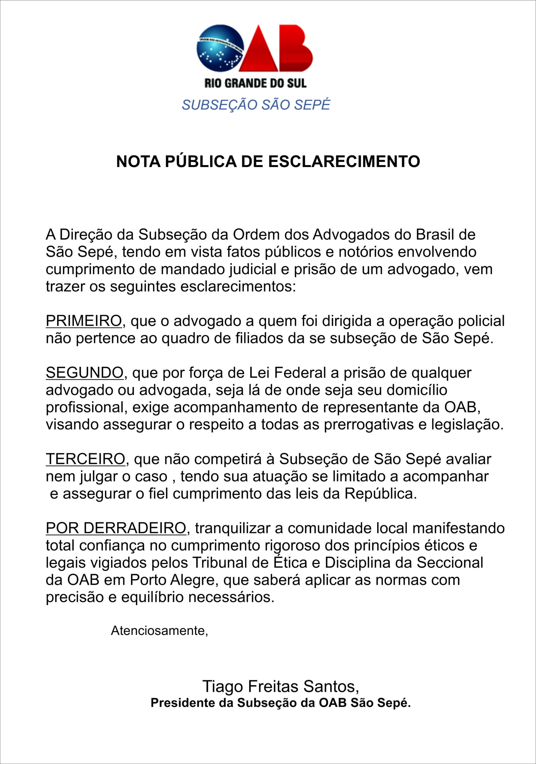 O Presidente da Subseção da OAB São Sepé, Tiago Freitas Santos, emitiu nota após a deflagração da operação da Polícia Civil que acabou com a prisão de um advogado. O caso aconteceu na manhã desta quarta-feira, 18, no município sepeense.